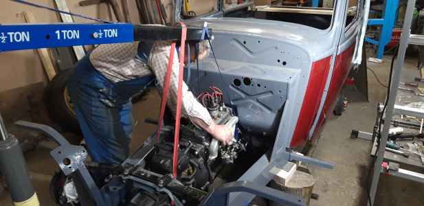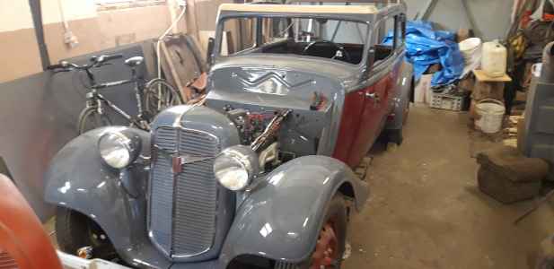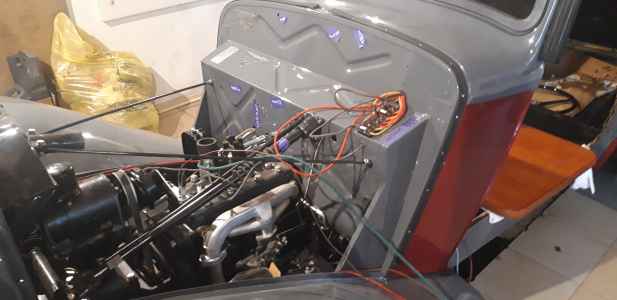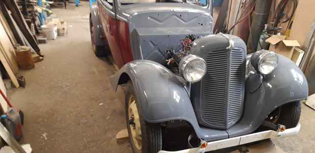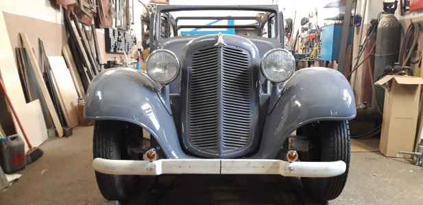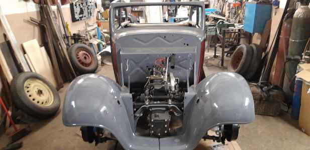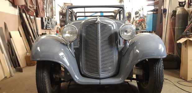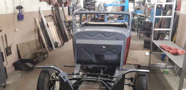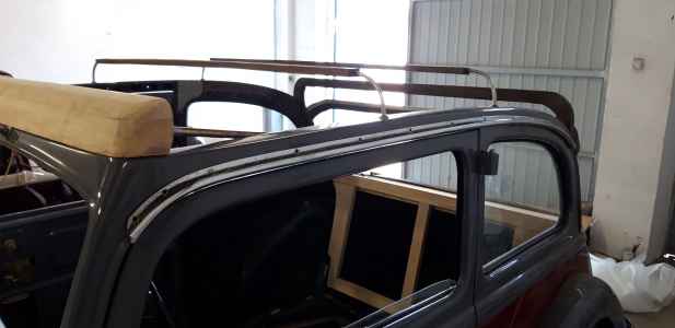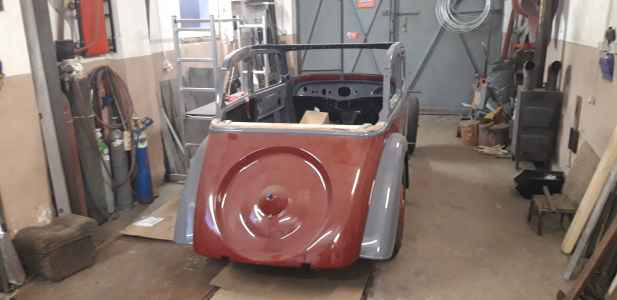 Orzeł poskładany i przygotowany do tapicera - instalacja elektryczna wykonana, silnik pracuje, jedynie listwy dachowe są do reklamacji, ponieważ wypolerowane są z nie tej strony co trzeba. Bardzo trzeba się pilnować i informować wcześniej wykonawcę, aby afekt końcowy był zadawalający. Nie mam też jeszcze ramki przedniej szyby. Trzeba ją wykonać - wyprodukować, dorobić  jak zwał tak zwał znowu trzeba poświęcić czas. Brakuje jeszcze kilka innych drobiazgów do wykończenia, ale będę je uzupełniał po odbiorze auta od tapicera. Np. lusterka boczne - też trzeba je wykonać ponieważ lustra z epoki są nie osiągalne.