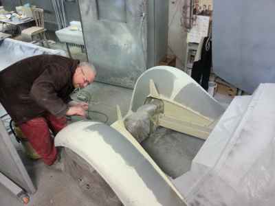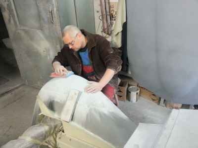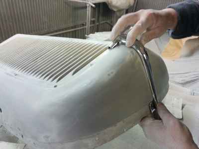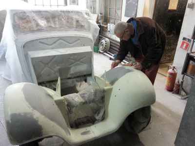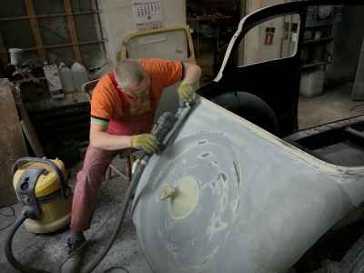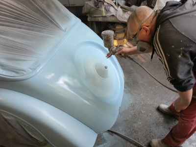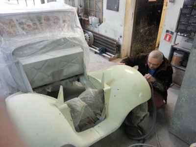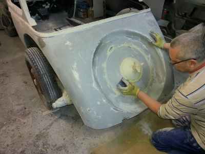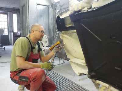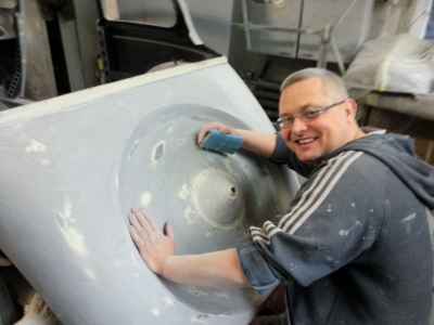 Jednym z wielu elementów do przygotowania są błotniki przednie. Jest to trudne i odpowiedzialne zajęcie, ponieważ błotniki przednie, atrapa jak i maski, są na pierwszym planie i wyprowadzenie idealnych obłości to nie lada wyzwanie – każda minimalna niedoskonałość będzie widoczna na lakierze.