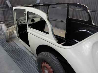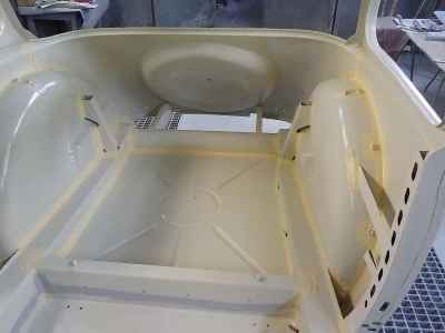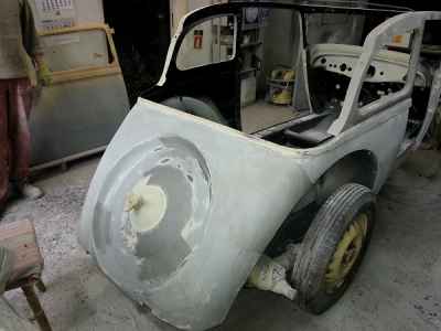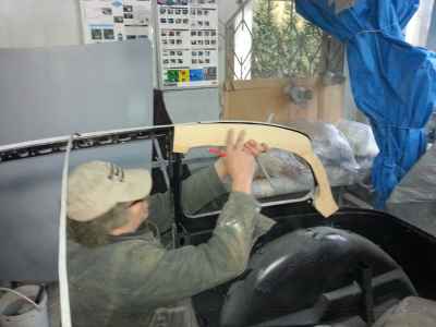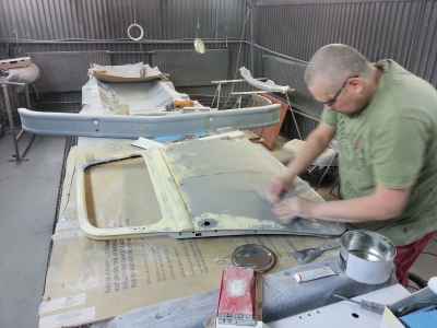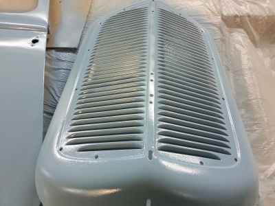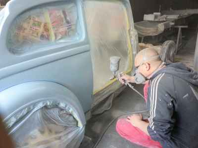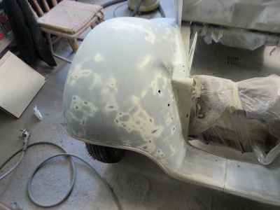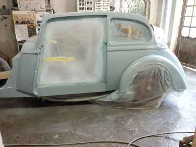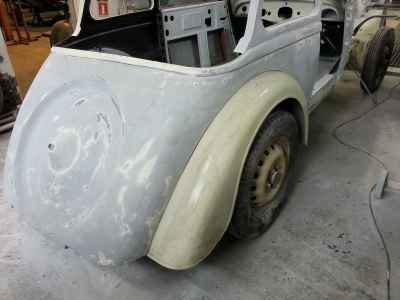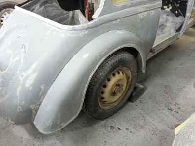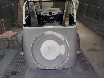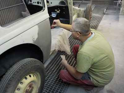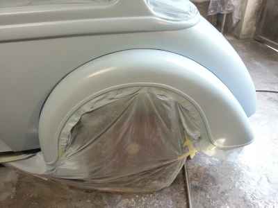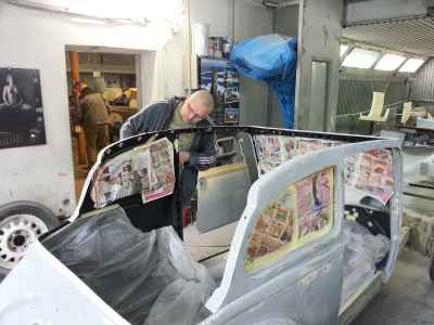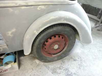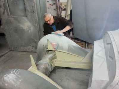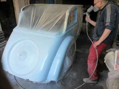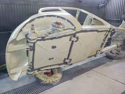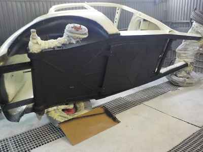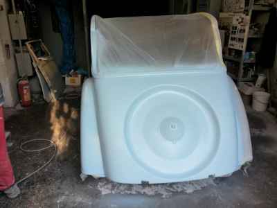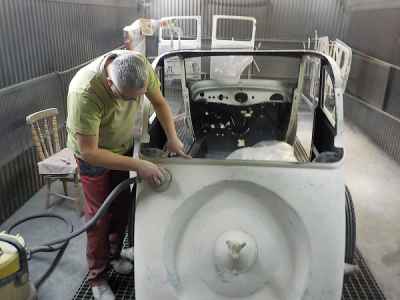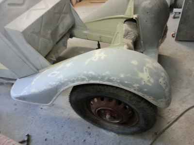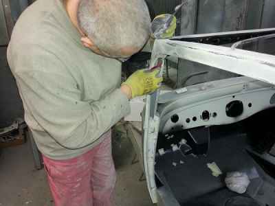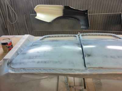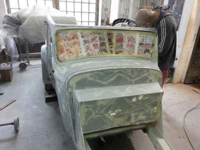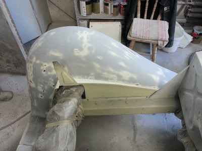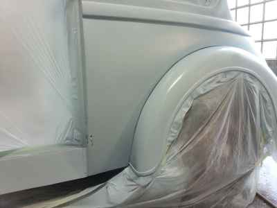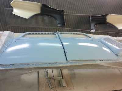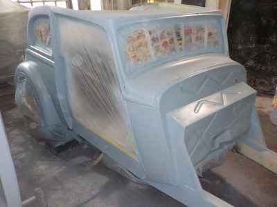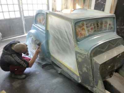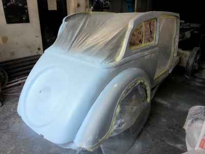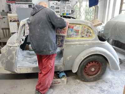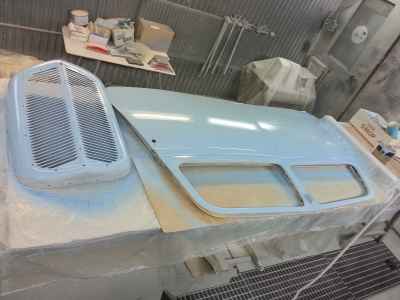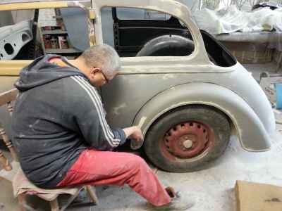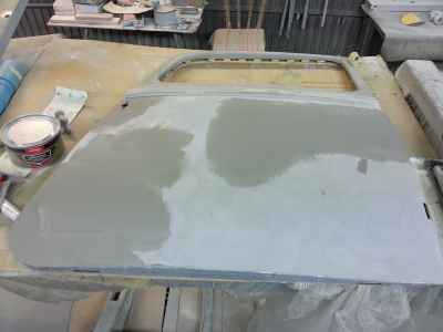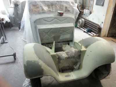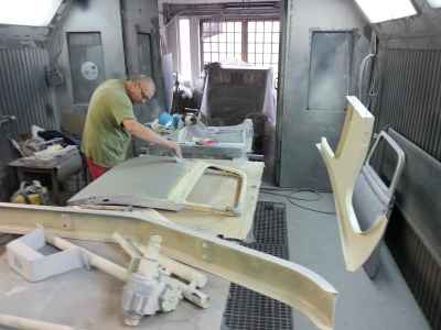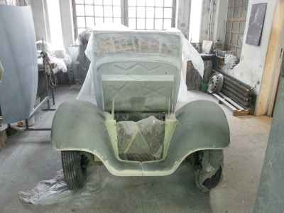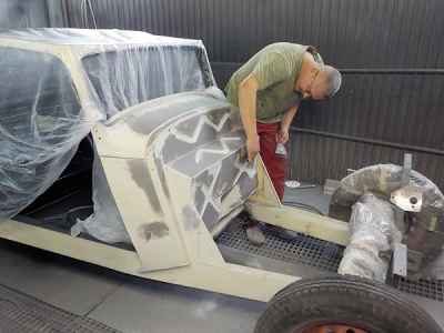 Teraz, kiedy karoseria jest już wstępnie wyprowadzona i pokryta szpachlą natryskową – niech sobie schnie, a w tym czasie można przygotowywać następne elementy karoserii , – drzwi, błotniki przednie, maski i atrapę.