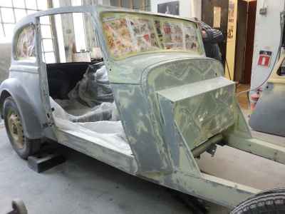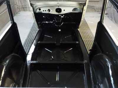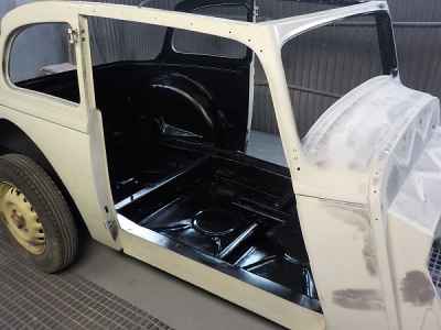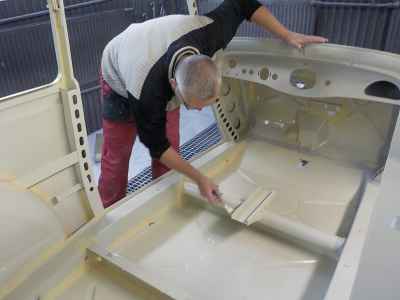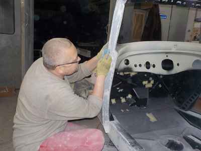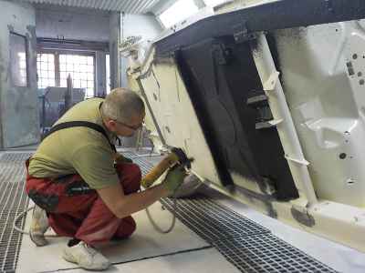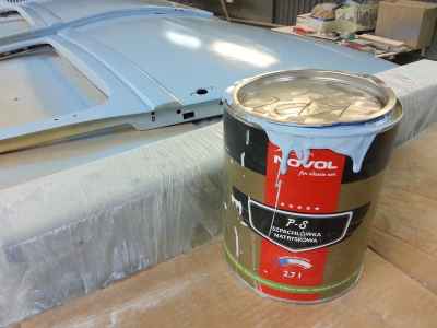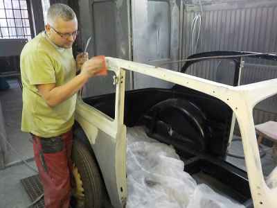 Po podkładach, gumach i barankach kolej na lakier. Dlatego też wnętrze adlera zostało pomalowane lakierem akrylowym. Jest to ostatnia warstwa lakieru pod tapicerką, na którą zostaną przyklejone jeszcze maty wygłuszające. Natomiast na zewnętrznej części karoserii trwają już prace przygotowawcze pod lakier – czyli szpachlowanie. Wszystkie materiały lakiernicze użyte przy renowacji tego ADLERA są firmy: NOVOL For Classic Car – to produkty i technologia wspierająca wszystkie etapy prac, rozpoczynając od oczyszczenia i wstępnego zabezpieczenia antykorozyjnego poprzez zabezpieczenie podwozia i nadkoli, aż do przeprowadzenia właściwego zabezpieczenia antykorozyjnego karoserii oraz nałożenie poszczególnych warstw szpachlówek, podkładów, aż wreszcie koloru i lakieru.