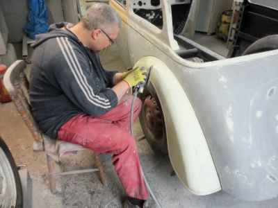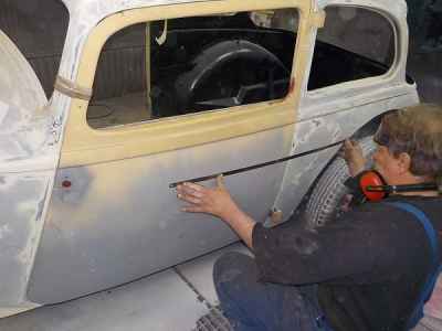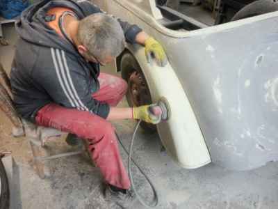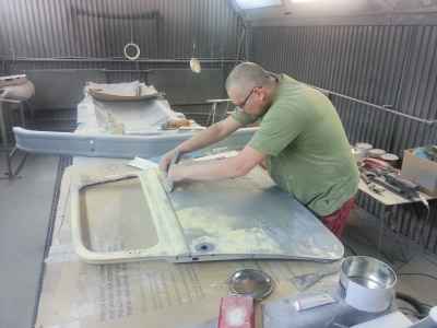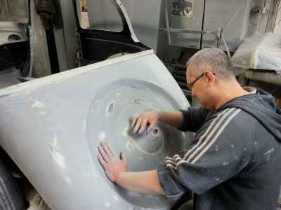 Najbardziej czaso i pracochłonnym zajęciem jest szpachlowanie i szlifowanie, aby doprowadzić powierzchnię do idealnej. Na tym etapie zastosowana była szpachla aluminiowa firmy: NOVOL For Classic Car