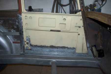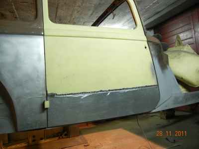 Drzwi to bardzo istotny element pojazdu, naprawa blacharska wymaga dużego          doświadczenia. Należy uważać aby się nie skręciły pasowały do otworu między słupkami, no i oczywiście szczeliny. Muszą być w koło idealnie równe. Należy również pamiętać o prowadnicach szyb i ich mechanizmach do podnoszenia. Do naprawy drzwi zamieszczonych na powyższych zdjęciach wszystkie reperaturki blacharskie zostały wykonane ręcznie, (dostępne w zakładce – sklep). Po zespawaniu punktowym płatu drzwi, szczelina została wypełniona cyną i wyrównana gładzikiem – na etapie lakierniczym zminimalizuje to ilość szpachlówki użytej do wyrównania i zapobiegnie w przyszłości pękaniu w miejscu łączenia.